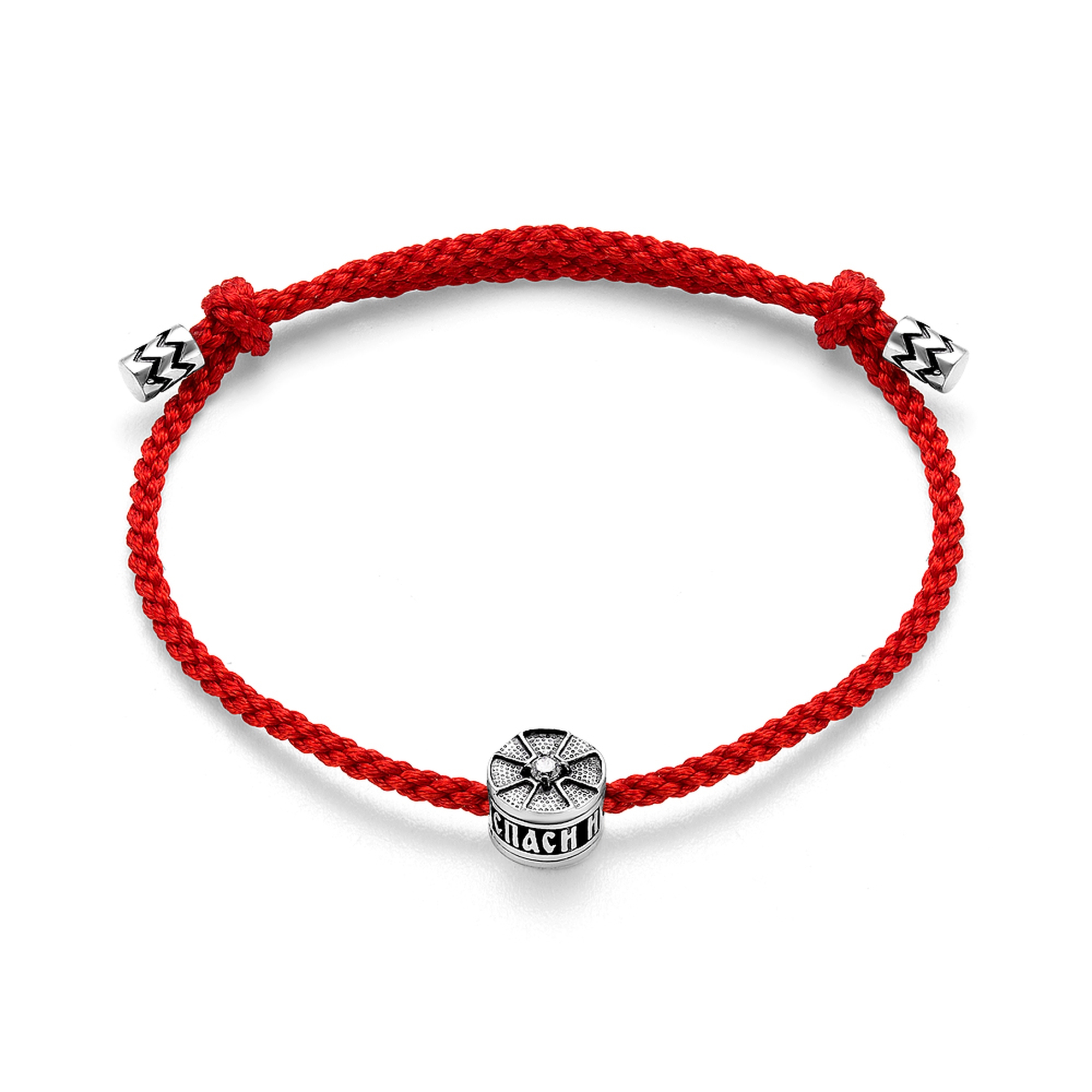 Аккуратный браслет с молитвой "Спаси и Сохрани" , Молитва расположена на бусине ,которая свободно передвигается по текстильному гайтану красного цвета.Плетение паракордовое ,размер 2 мм.Оконцовки гайтана цилиндрической формы . Сама бусина с лицевой стороны украшена крестом,по центру которого располагается цитрин,установленный по принципу бриллиантовой закрепки, на оборотной стороне знак "Хризма". Текст молитвы сквозной