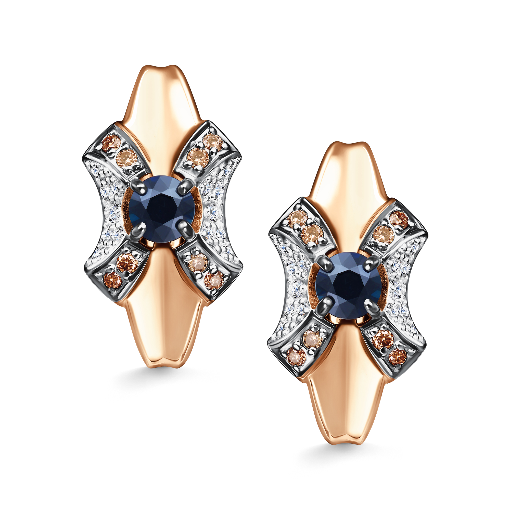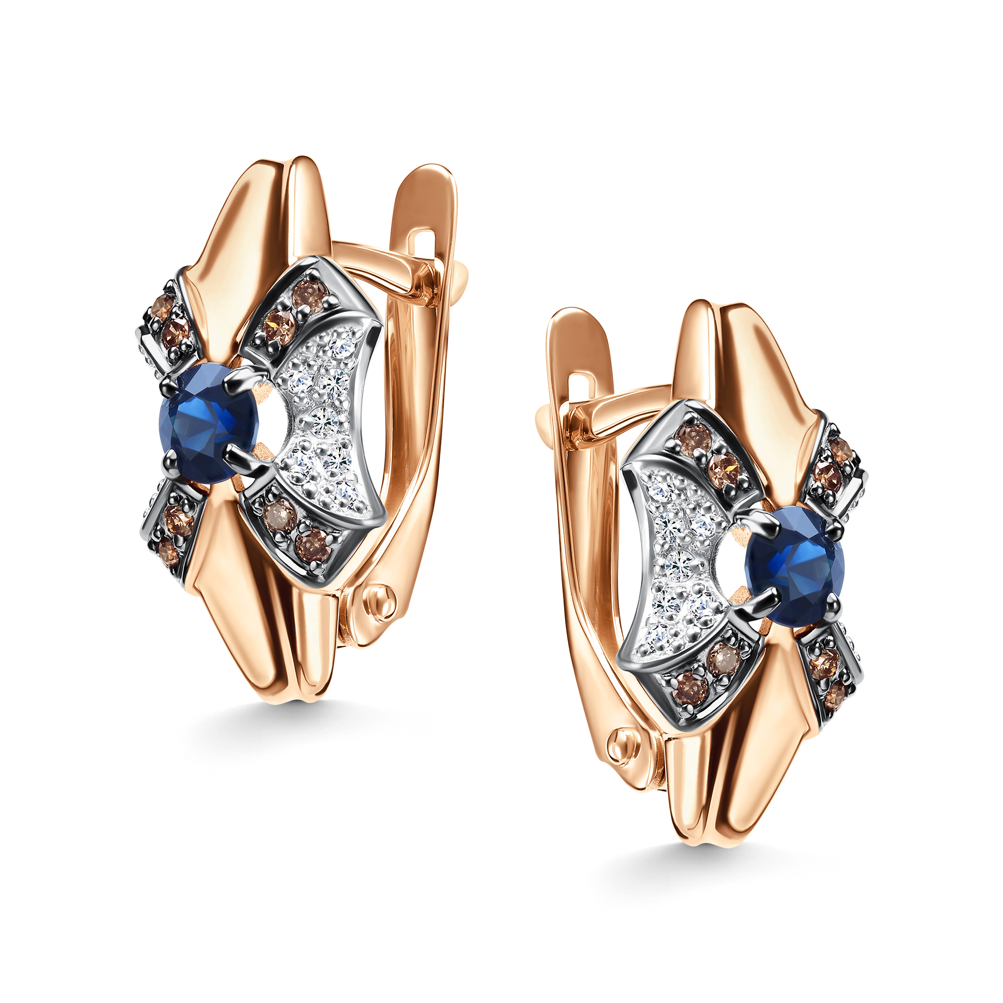 Золотые серьги АЛЬКОР 26698-170 с бриллиантом, сапфиром и коньячным бриллиантом