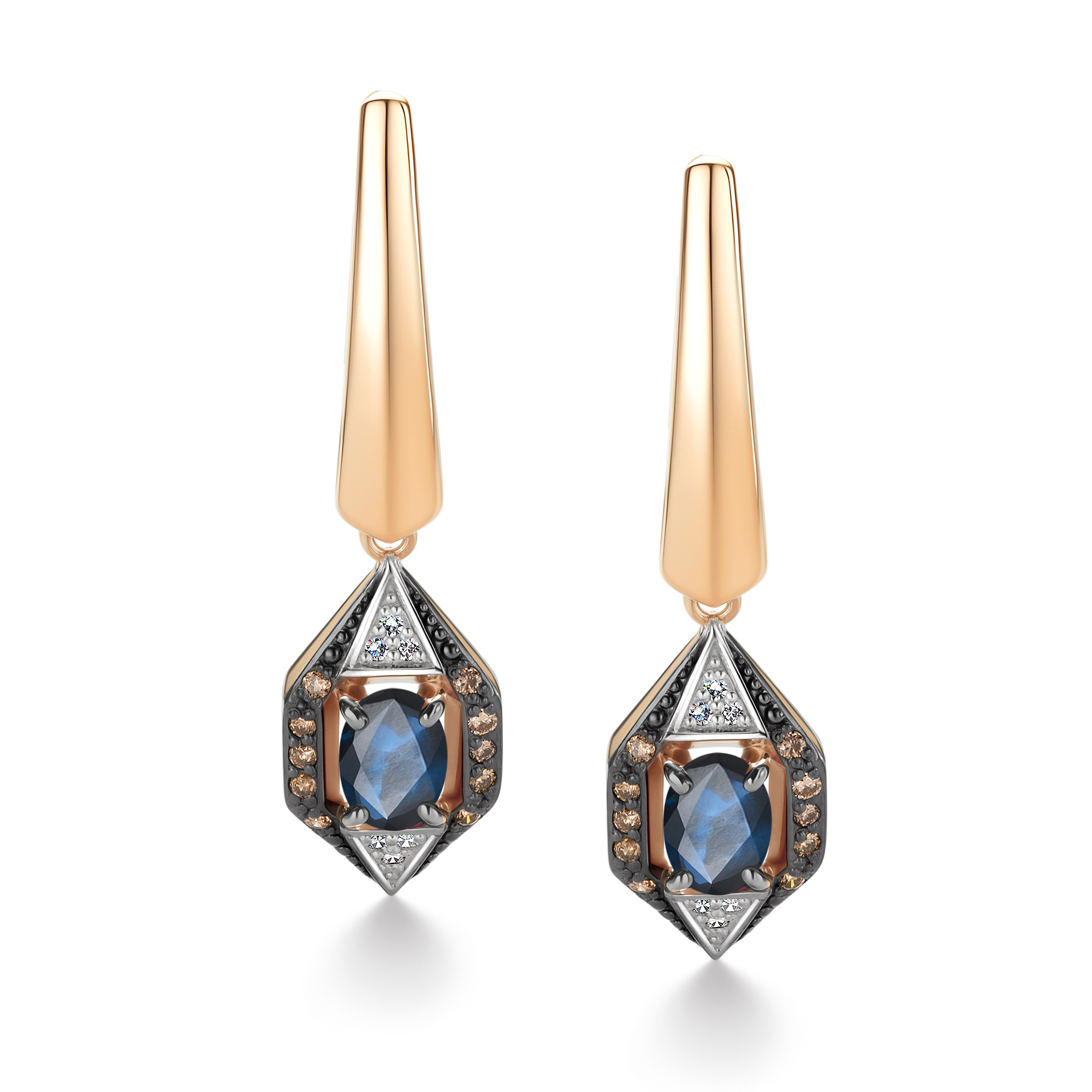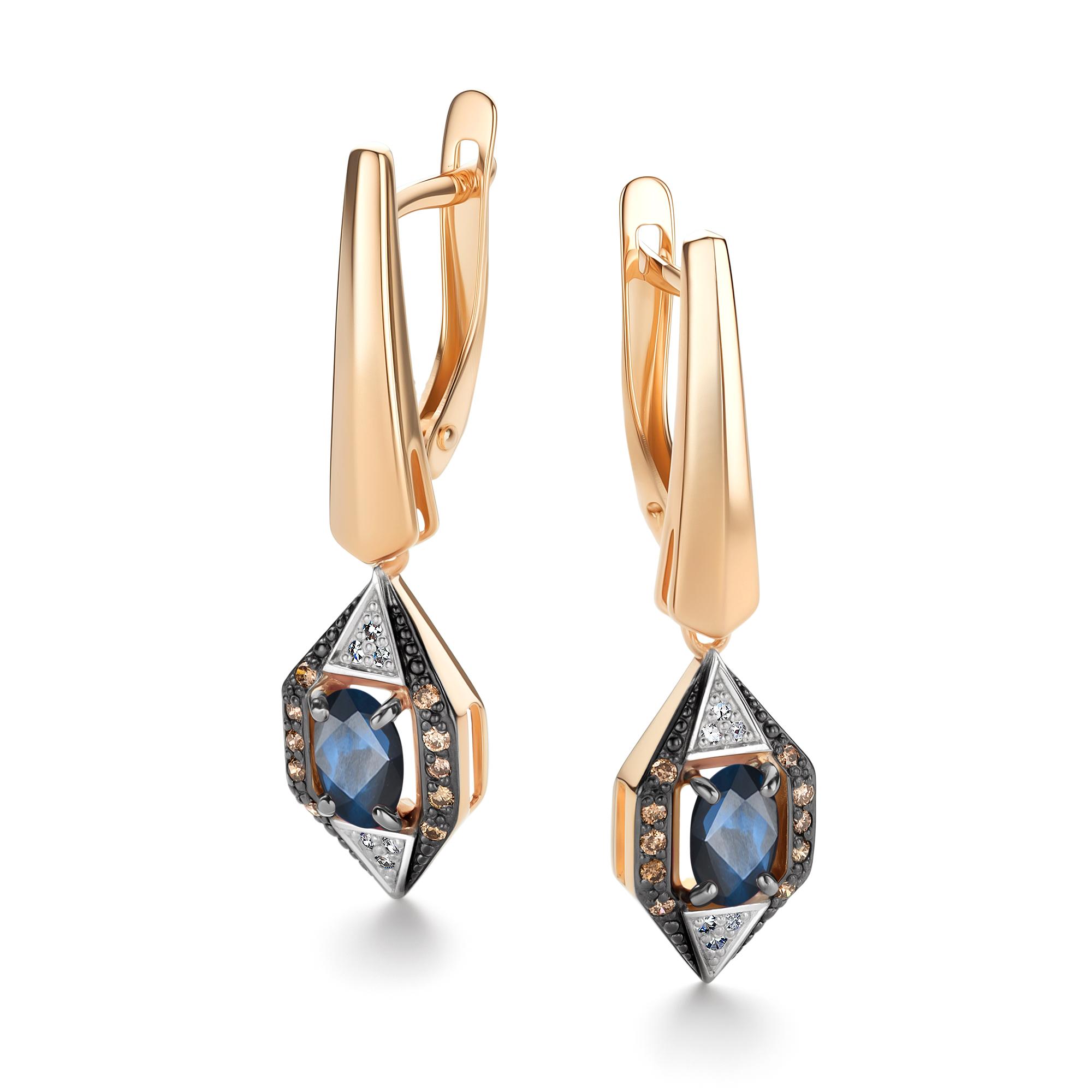 Золотые серьги АЛЬКОР 26701-170 с бриллиантом, сапфиром и коньячным бриллиантом